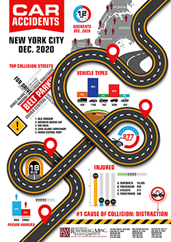 In December 2020, in the City of New York, the top five streets where collisions occurred were Belt Parkway, Brooklyn Queens Expressway, FDR Drive, Long Island Expressway, and Grand Central Parkway. #1 Cause of collisions was caused by distraction. 90% of the injuries were the motorists. 57% of the gender of the person involved were male. There were on average of 277 crashes/day. 7,100 collisions were from passenger vehicles.